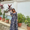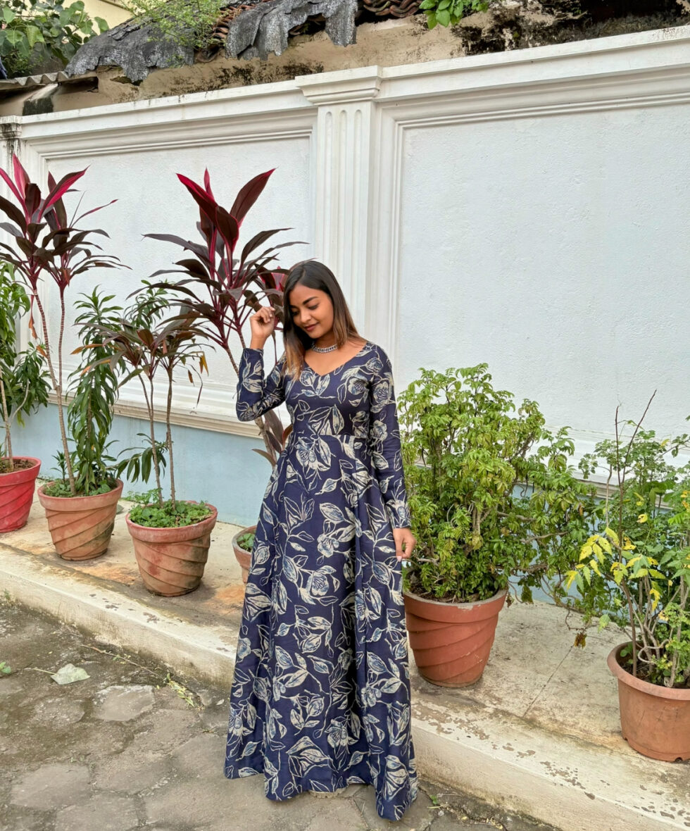 A navy blue floral maxi dress designed for effortless elegance and all-day comfort. Perfect for casual outings and festive moments with its flowy silhouette.