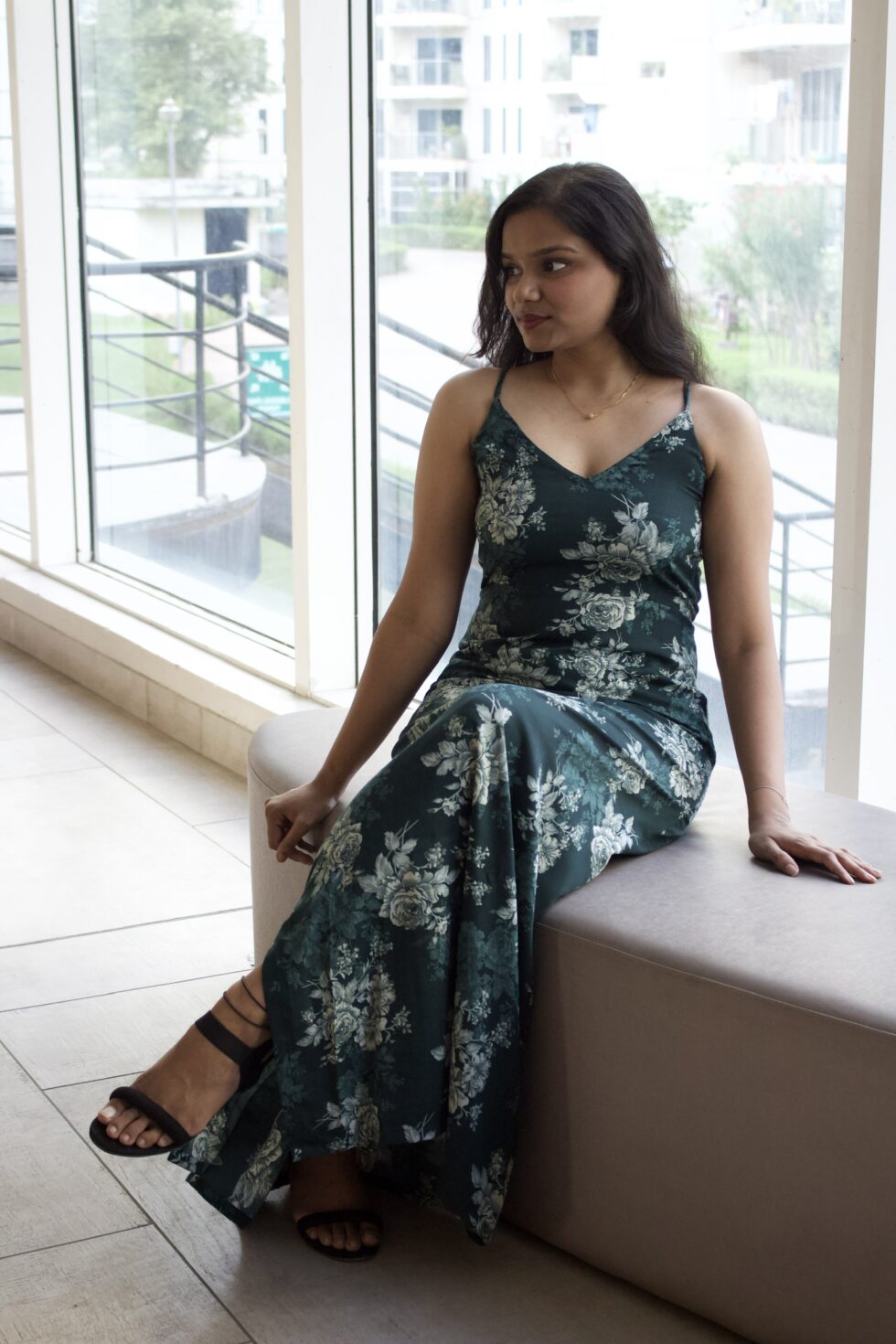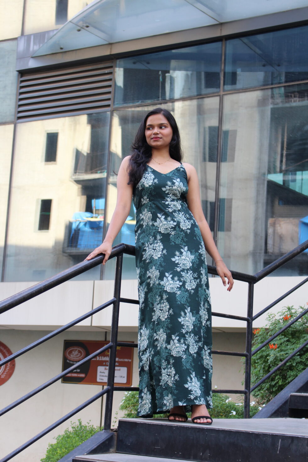 “Make a graceful statement in this emerald green maxi slip dress adorned with delicate floral prints. Designed with adjustable spaghetti straps and a flattering fit, this dress flows effortlessly for a chic yet comfortable look. Perfect for brunch dates, garden parties, or evening strolls, it pairs beautifully with sandals, wedges, or even casual sneakers.”