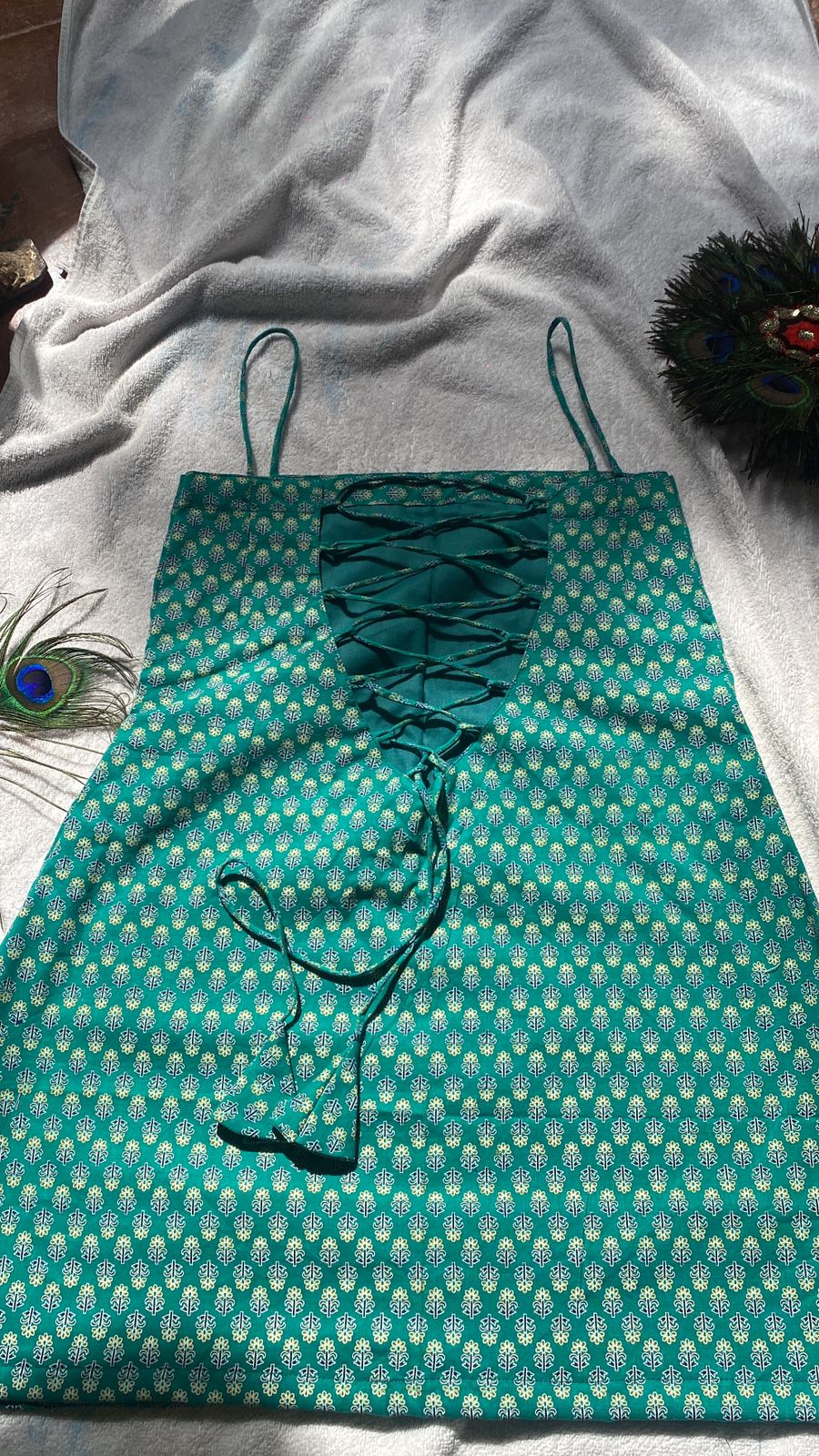 Turn heads with the Ira Kurti, styled in a striking peacock green print. Featuring delicate noodle straps, a sleeveless and backless silhouette, and a corset back that flatters every curve, Ira is all about effortless elegance. A new arrival and already stealing hearts, it’s the perfect statement piece for your wardrobe. ✨